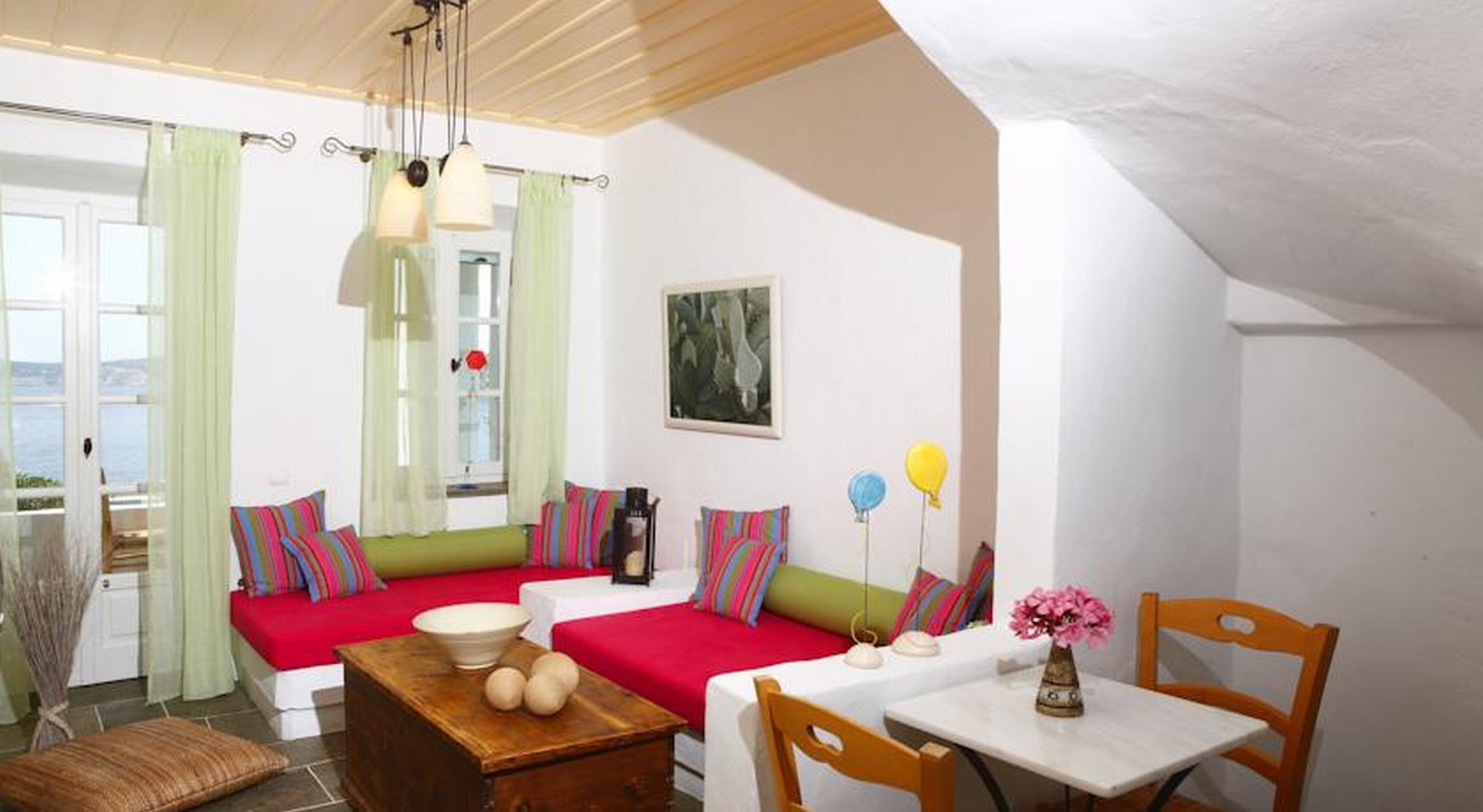 Each with a sea view, rooms combine Cycladic elements with contemporary aesthetics. Amenities include free Wi-Fi, a satellite TV with DVD player, as well as a kitchenette and minibar. Korres bathroom amenities, bathrobes and slippers are offered.