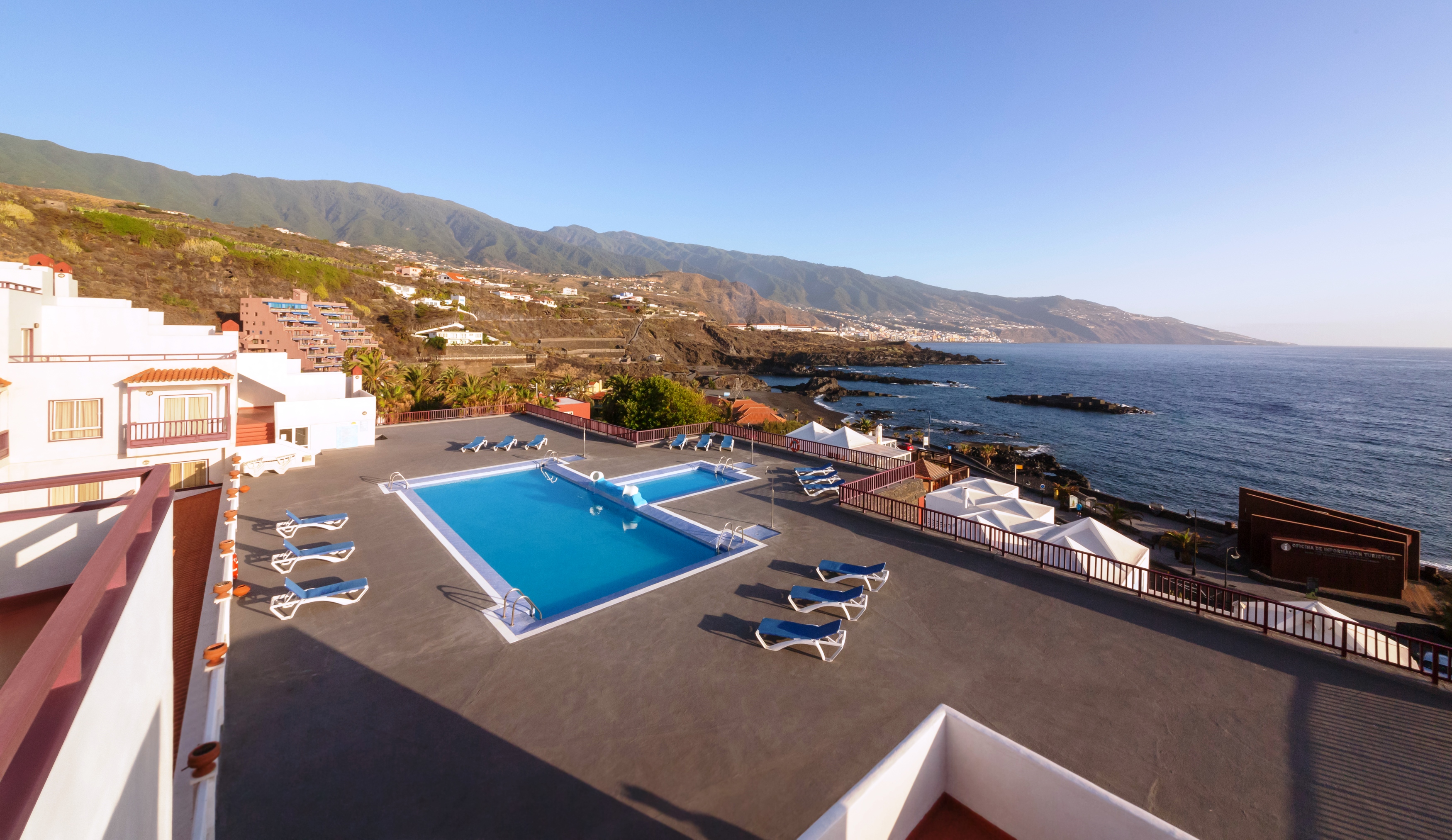 The complex has 100 apartments with 24 hour reception service, luggage storage, wake-up call service, free Wifi in the hall, free internet corner and launderette. We have two swimming pools, one for children bordered with a large solarium with sun beds where you can sunbathe and enjoy excellent views of the sea and Santa Cruz de la Palma. We also accept pets upon request and with an extra charge. Free parking is available in front of the apartments.